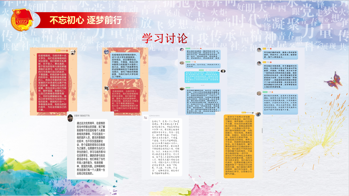 本次活动通过钉钉平台进行,在钉钉直播间里放映焦作市武陟县中水寨村马明杰等100名大学生群体有关小视频,带领大家进行学习。从下午2:30开始到晚上10:00结束,两个年级的班群和各寝室群里热烈讨论马明杰等10名大学生优秀群体有关事迹并发表感想。同学们经过思考与领悟,纷纷写出自己的心得体会。