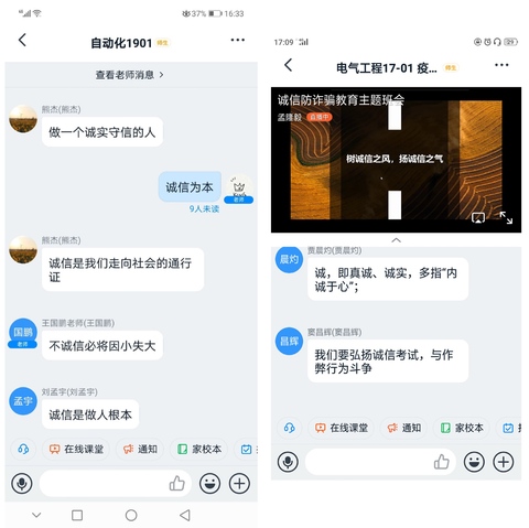 按照学校工作要求,结合学院实际情况,风月文学 各年级辅导员充分利用钉钉、QQ视频会议等网络载体,对本班同学的诚信、征信、预防诈骗、远离不良贷意识进行了强化警示教育。会上,各辅导员强调诚信是大学生立身为人、成长成才的必备品质。诚信不仅是一种品行,更是一种责任;不仅是一种道义,更是一种准则;就个人而言,诚信是高尚的人格力量。学生在申请国家助学贷款、国家助学金等国家资助项目时,应恪守诚信,如实填报申请材料,树立诚信观念,增强法律意识,及时履行国家助学贷款合同。同学们纷纷表示会在以后的工作与学习中处处做到诚信,为精彩的人生道路打下坚实的基础。