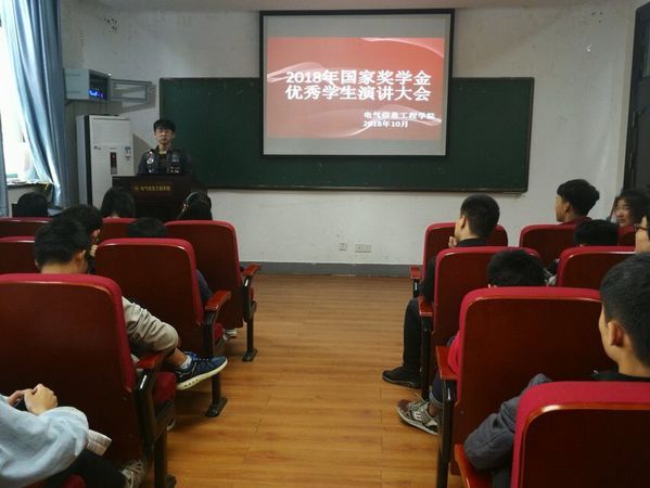 大会开始,学生工作服务中心主任谢鑫对获得国家奖学金的优秀同学表示了衷心的祝贺,同时希望同学们向优秀学生代表学习,不断完善并全方位提高自己。接着,2018国家奖学金获得者:自动化1602班孟想、电气1502班杨润霞以及智能电网1501班孙甜上台演讲,三位学生分别从如何提高学习能力、提升个人综合素质、如何合理利用课余时间等方面做出演讲,给予了学弟学妹们好的学习经验。会议最后她们向所有在座学生发出了“共同努力,建设学习氛围更加浓厚的电气学院”的号召。
