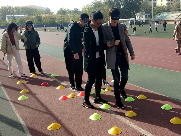 活动开始,心理委员向大家介绍了“踩气球”、“盲人与哑巴”、“十人九足”三个小游戏的规则。之后班级同学开始分组进行游戏,以“踩气球”作为热身运动,气氛很快开始活跃起来。紧接着“十人九足”考验了大家的耐心与协作能力,使大家明白了团队合作的重要性。最后以“盲人与哑巴”收尾,使大家在游戏的欢乐中也体会到了团队的重要性。本次活动主要通过游戏的方式,剖析大学生面临的心理困惑,有效的宣传了心理知识。