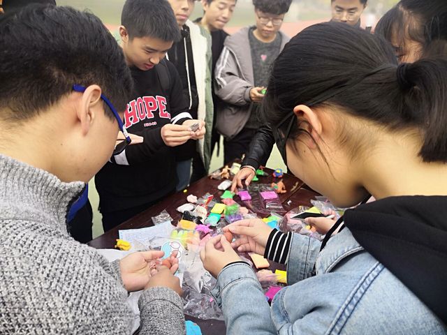 在学校运动场,项目负责人介绍了活动背景和相关活动设置。此次活动主要项目有“盲人方阵”、“盲人手工制作”、“分享交流”三个部分。“盲人方阵”充满了趣味性和挑战性,游戏需要两人配合进行,一位同学需要带上眼罩在另一位同学的指导下在障碍路段前行。该项目主要增加了彼此之间的信任,同时使同学们进一步的了解彼此;“盲人手工制作”需要两人合作完成一个小的手工,同样在一人带上眼罩的情况下,两人配合完成。该项目则更多的培养了彼此之间的默契和协调合作能力。活动需要依靠两人的默契合作完成,使同学们体验到合作的快乐。“分享交流”阶段,同学们说出自己内心的真实想法,跟同学们分享自己的活动心得以及生活上遇到的各种影响自己心理状态的事情,让内向的同学去开放自己,大胆的讲出自己的故事,多跟同学们互动,融入到集体当中去。