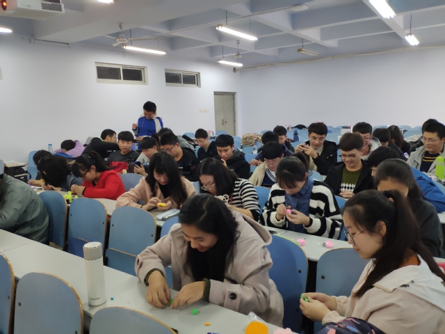 项目分为三个部分进行。项目主持人首先为同学们讲解泥面塑心的相关规则,阐述了相关的心理原理和作用。全体参与者以宿舍为单位,以“动物世界”为主题进行彩泥创作,通过手中不同的动物颜色、形态来表现同学们丰富的内心世界。大家或搓、或捏、或揉、或压,缤纷的彩泥在手中变换着各种形状,老虎、狮子、猪等动物形象栩栩如生。大家体会到了创作的快感和自我表达后的舒畅。最后在主持人的带动下,大家分享了自己的创作成果和心得体会。
