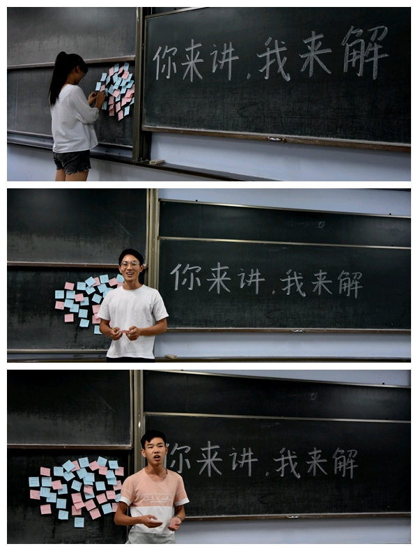 活动开始时,心理委员高卓向大家发放便利贴,并请在场的同学将自己最近遇到的烦心事都写在便利贴上,有序地粘贴在黑板上。随后,高卓鼓励大家踊跃上台,撕下便利贴,针对同学们在上面给出的烦事开出自己的“心理小药方”,为周围的伙伴们解决烦恼。活动气氛活跃,大家争先上前撕下便利贴,说说自己的解决方法。发言的同学幽默风趣,使得现场暴发阵阵笑声。