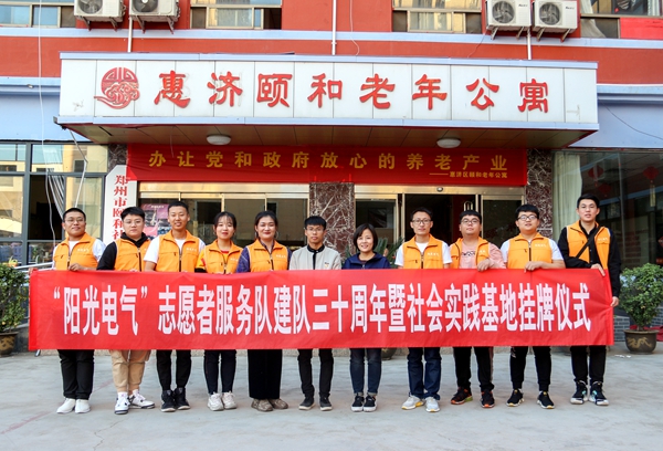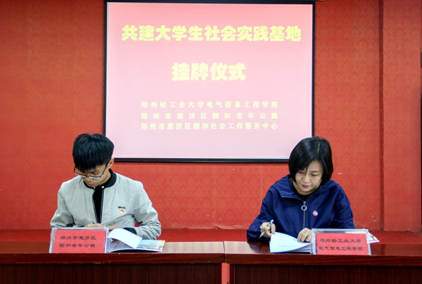 与郑州市惠济区颐和老年公寓共建大学生社会实践基地签约暨挂牌仪式在郑州惠济颐和老年公寓顺利举行。学院代表孔朋老师、“阳光电气”志愿者服务队成员和颐和老年公寓社工负责人参加仪式。