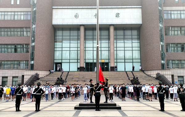 9月14日上午6:50,风月文学 于东风校区图书馆广场举办升国旗仪式。2019级各班学生代表共200人参加仪式。