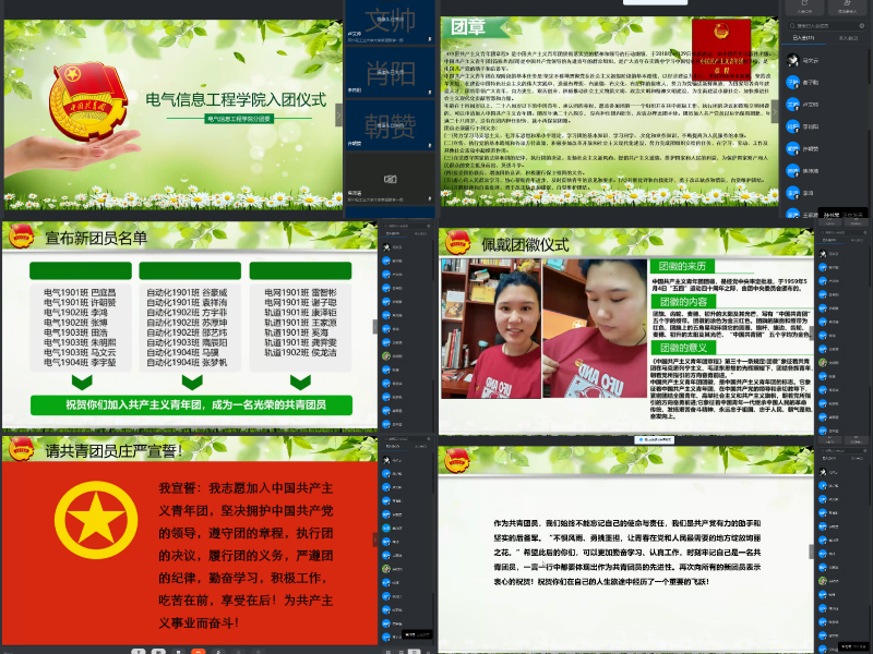 隔屏相见,网络传输,不一样的入团仪式让同学们感受到了入团的光荣,更加坚定了向团组织靠拢的信念。无论是老团员或是新团员,都体会到自身的责任与使命:作为新一代青年团员我们应该积极响应党的号召,传承五四精神,为国家、为社会不懈奋斗,让人生的价值在奉献中实现,以良好风貌和积极作为迎接中国梦的实现。