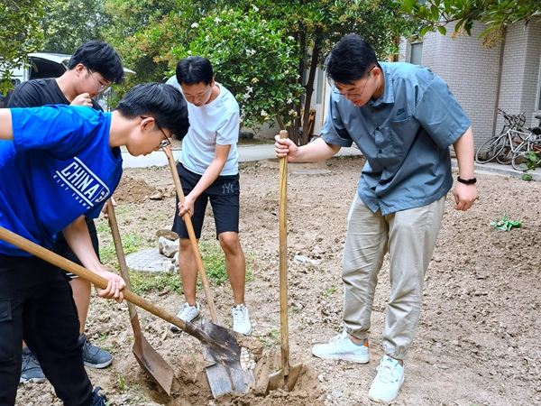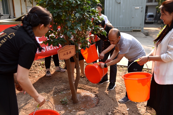 活动中,师生们一起扶苗、培土、围堰、浇水,共同种下寄托着学生们对母校深厚情感的“山茶花树”,并合影留念。毕业生代表孟隆毅表示,在即将毕业踏上新征途的时刻,能亲手为母校种下留念树有着特殊的意义,它寄托着毕业生全体同学对母校的深厚情感,种下了对母校的怀念与感恩,留下了美好的大学回忆;同时勉励自己坚定志向,在未来的工作学习中努力奋斗,像茁壮成长的树苗一样为母校添色,为母校增光。
