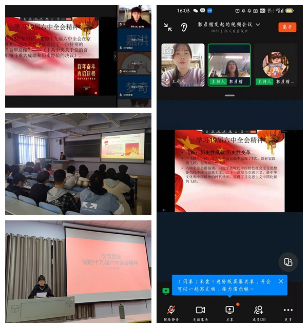 党的十九届六中全会是在我们党百年华诞的重要历史时刻,在“两个一百年”奋斗目标历史交汇关键节点上召开的一次具有重大历史意义的会议。“回望来时的路,看清脚下的路,才能更好地坚定前行的路。”这次全会全面总结了党的百年奋斗重大成就和历史经验,也更明晰了新征程的奋进方向。各团支部系统学习了《中国共产党第十九届六中全会公报》,重点学习十九届六中全会上通过的《中共中央关于党的百年奋斗重大成就和历史经验的决议》。同学们纷纷表示,要积极响应中央号召,坚决做到“两个维护”,更加坚定“四个自信”,牢固树立“四个意识”,从党的百年奋斗历程中汲取奋进力量,更加紧密地团结在以习近平同志为核心的党中央周围,不忘初心、牢记使命,攻坚克难、开拓奋进,为实现第二个百年奋斗目标而不懈奋斗,以实际行动检验学习成效。