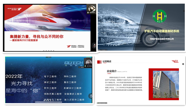 在直播中,光力科技股份有限公司、河南辉煌科技股份有限公司、郑州捷安高科股份有限公司、新开普电子股份有限公司、河南护航实业股份有限公司分别进行线上招聘宣讲,向同学们介绍了公司的基本情况、主营业务、发展前景、薪酬福利、应聘要求,对招聘的岗位,现场线上提供电气工程师、硬件工程师、仿真工程师等就业岗位四十余个,覆盖电气、自动化、轨道、计算机、软件等十余个专业。