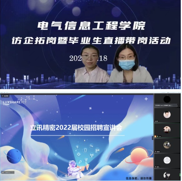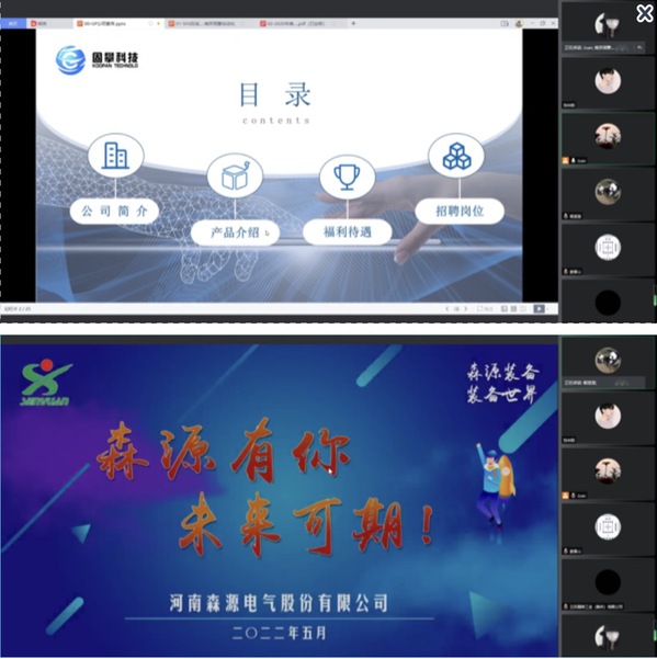 在直播中, 立讯精密工业(滁州)股份有限公司、南京固攀自动化科技有限公司、郑州海意科技有限公司、森源电气股份有限公司分别进行线上招聘宣讲,向同学们介绍了公司的基本情况、主营业务、发展前景、薪酬福利、应聘要求,对招聘的岗位,现场线上提供电气工程师、硬件工程师、仿真工程师等就业岗位三十余个,覆盖电气、自动化、轨道、企业管理、市场营销、计算机等十余个专业。