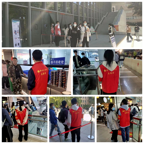 志愿者们身穿红色马甲,准时到达执勤岗位坚守各自的点位,督导同学们的不文明现象。他们负责提醒同学正确佩戴口罩,提醒同学有序排队,避免造成拥堵。同时负责每层楼的巡逻以防同学们遇到问题无法得到妥善的处理。