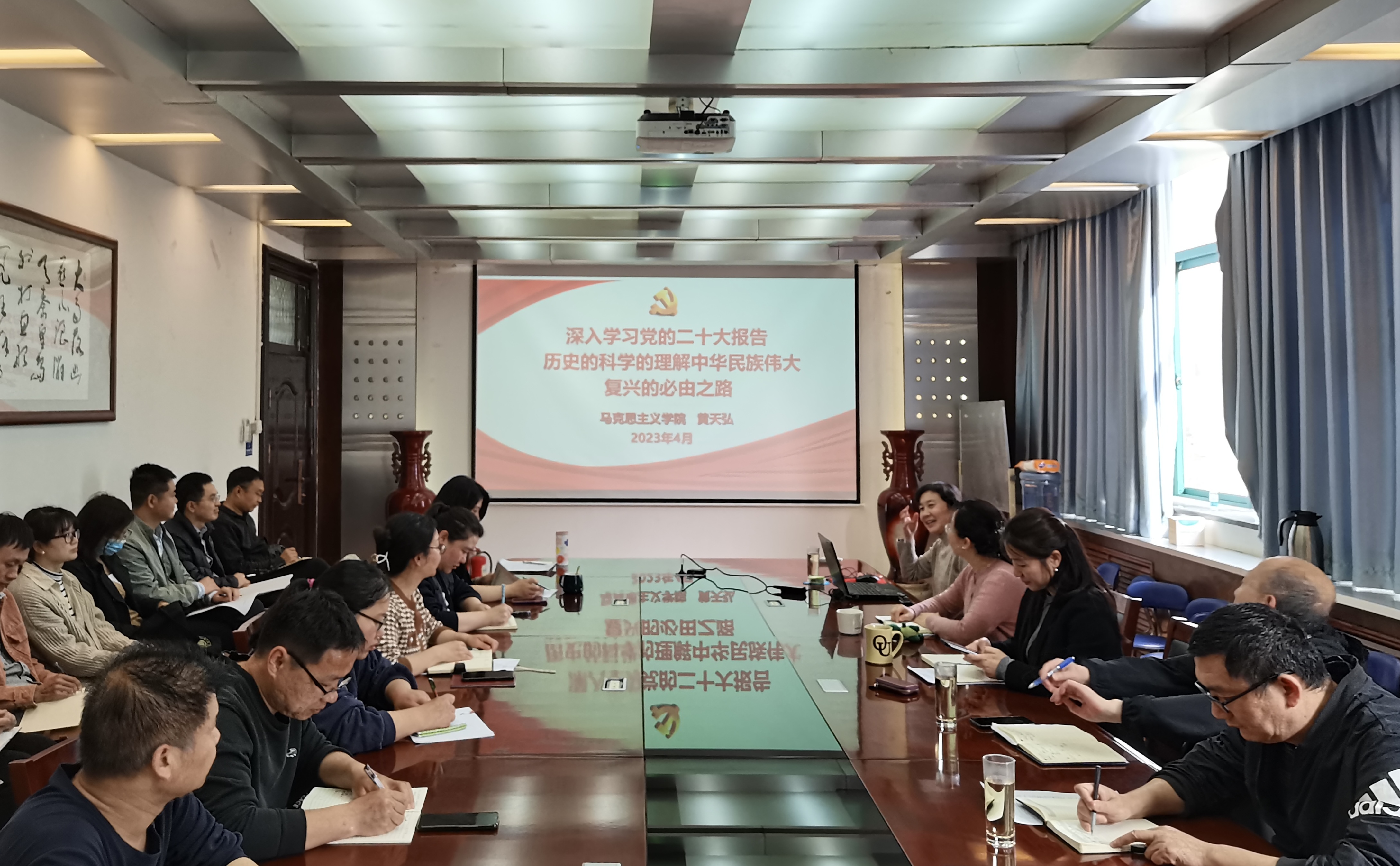 会议邀请马克思主义学院副院长黄天弘教授作题为《深入学习党的二十大报告——历史的科学的理解中华民族伟大复兴的必由之路》的专题辅导报告。黄教授从中华民族伟大复兴的主要论述、中国式现代化及其特征、新时代中国式现代化实践和理论探索的新成就等三个方面进行了深入细致的阐述;从历史的、科学的角度讲述了近现代以来中华民族实现伟大复兴的奋斗历程;论述了中国式现代化理论是科学社会主义的最新重大成果,是我们党领导全国各族人民在长期探索和实践中取得的重大成果。此次辅导报告内容丰富、立意深远、史料详实、逻辑清晰,参会教师认真听讲,很有收获。