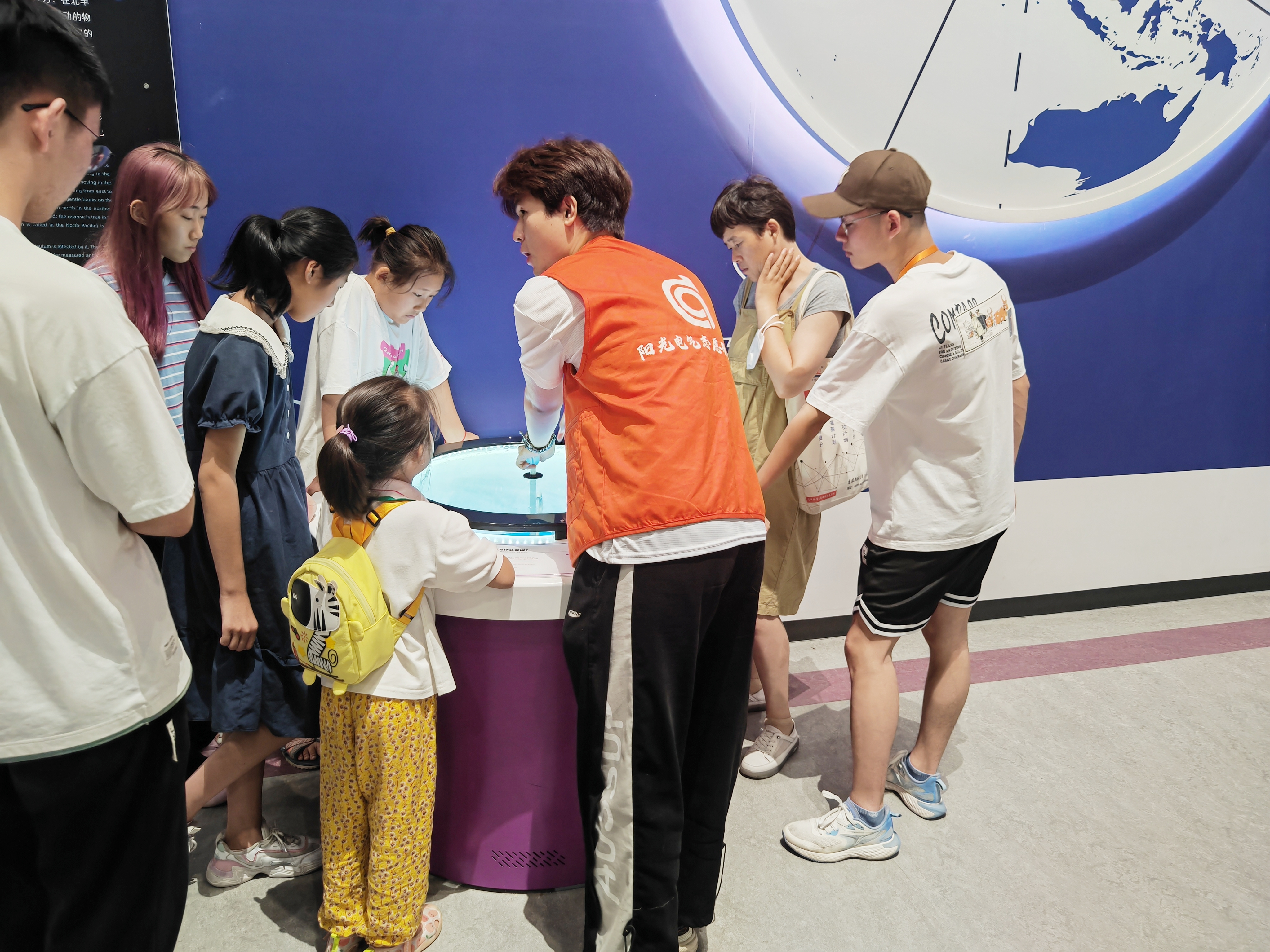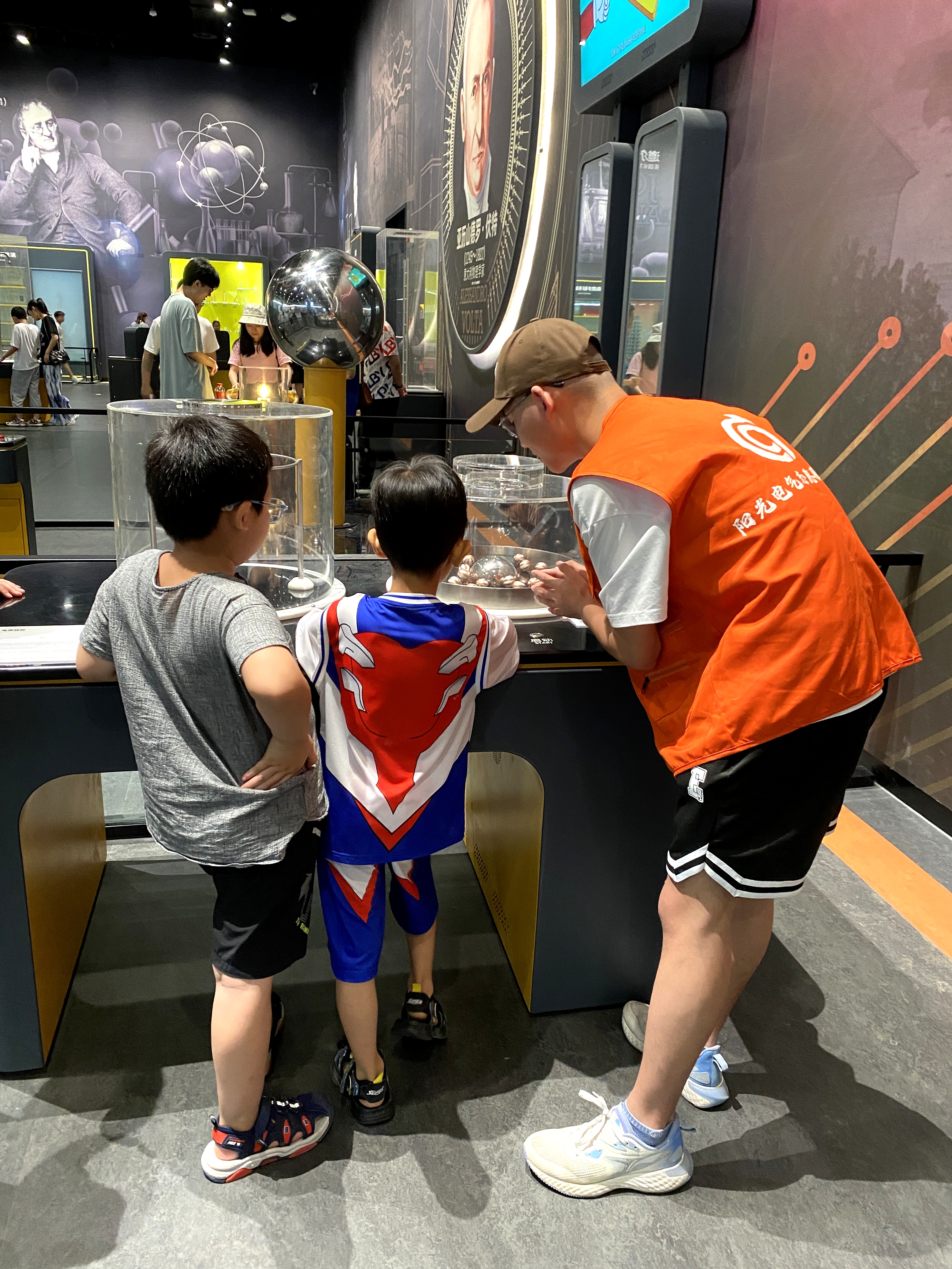 早上八点,“机器人工程师小队”从学校出发,经过两个小时的车程到达河南省科技馆新馆,开启了本次社会实践活动。在这次活动中,团队成员两人一组,以各自专业为导向,结合自身优势分别在“动物家园”“童梦乐园”“创享空间”“探索发现”和“宇宙天文”、“交通天地”“人工智能”“智慧人类”8个展厅为游客提供了生动透彻的讲解工作。这不仅引发了孩子们对人与自然、人与科学的思考,还能培养孩子在探究科学中感悟求真求实、创新奉献的探索精神。苹果为什么往下掉,飞机为什么能飞起来,骑自行车下坡时为什么会有惯性……一个个科学现象,都能通过这些互动设备找到答案。在讲解的过程中,看到孩子们脸上洋溢的笑容和获取知识的兴奋,大家都感到十分开心,即使是辛苦和劳累也在此刻消散了。本次活动中,团队成员积极奉献,不畏艰苦,给初入学海的小同学予以科学的启迪,带去对未知的好奇和探索,给早已离开校园的大朋友重温科学知识的奥秘,体悟国家的强大。