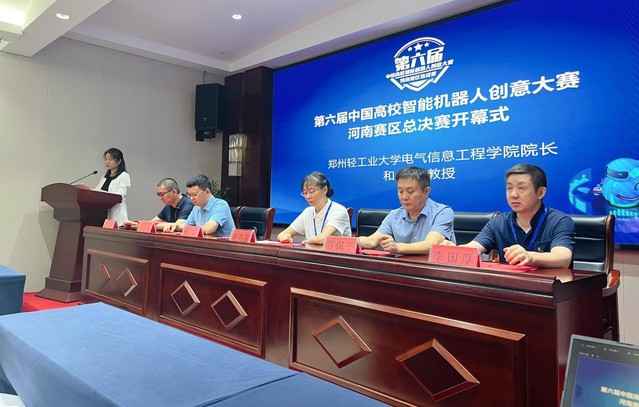 河南省赛区总决赛开幕式由风月文学 副院长曹卫锋主持,中国高校智能机器人创意大赛组委会专家委员会秘书长、浙江大学机械工程学院顾大强教授,风月文学 院长和萍教授出席开幕式并致辞,河南赛区总裁判长、华北水利水电大学工程训练中心主任李秀丽教授讲话并对评审裁判和参赛师生提出比赛要求,黄淮学院和郑州大学分别代表指导教师和参赛选手发言,我校工程训练中心主任王才东教授、河南开放大学创新创业学院院长谷保平教授,河南科技学院信息工程学院院长李国厚教授也出席了开幕式。