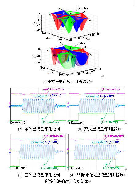 该文系统分析了常规双矢量和三矢量模型预测控制的有效性及其优缺点,首次提出混合多矢量模型预测控制可视化分析方法。与单矢量模型预测控制相比,常规双矢量模型预测控制具有更小的控制误差。然而,与双矢量模型预测控制相比,三矢量模型预测控制在整个电压矢量平面内并非始终优于双矢量法。根据该发现,论文提出了融合了双矢量和三矢量模型预测控制优点的混合多矢量模型预测控制方法,并对其有效性进行了可视化分析验证。最后,永磁同步电机实验平台上的实验结果表明,与现有方法相比,所提混合多矢量模型预测控制方法具有更小的电流纹波。
