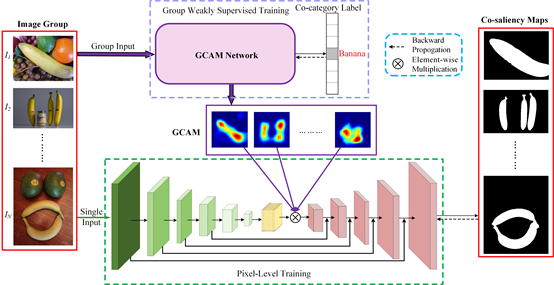 针对现有协同显著性检测结果容易受到非公共显著目标的干扰这一问题,论文提出了一种组弱监督学习引导的协同显著性检测方法。论文首先以一组相关图像的公共类别作为真值,通过弱监督学习的方式构建新的组类别激活图(Group Class Activation Maps, GCAM)网络,并且该网络产生的GCAM仅突显图像组中公共类别目标所覆盖的区域,最后通过将GCAM与基于特征金字塔网络的主干网络融合以推理协同显著图。实验结果表明,在受到相似非公共显著目标干扰的情况下,所提方法能够更准确地检测出公共显著目标。该成果可以为图像检索、目标检测和跟踪、目标协同分割等多种计算机视觉任务提供先验知识。