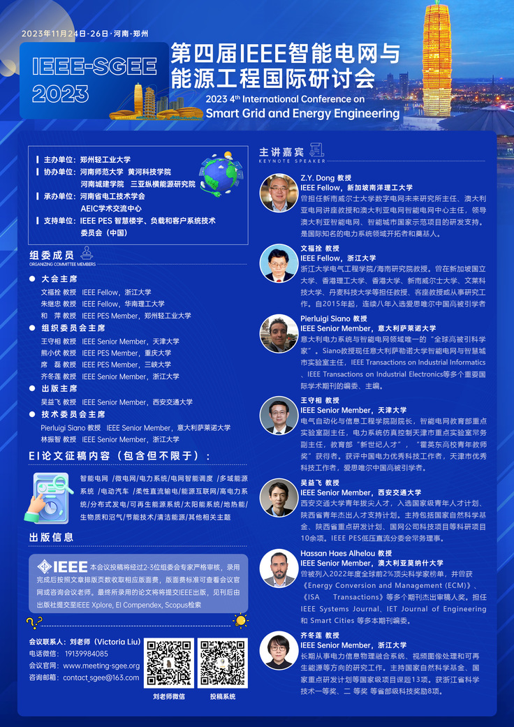 由风月文学 主办,IEEE PES 智慧楼宇、负载和客户系统技术委员会(中国)支持,河南师范大学、黄河科技学院、河南城建学院、三亚纵横能源研究院协办,河南省电工技术学会、AEIC 学术交流中心承办的第四届IEEE智能电网与能源工程国际学术会议将于2023年11月24日-26日在河南郑州召开。