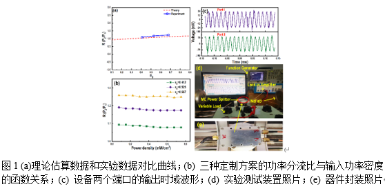 图1 (a)理论估算数据和实验数据对比曲线;(b) 三种定制方案的功率分流比与输入功率密度的函数关系;(c) 设备两个端口的输出时域波形;(d) 实验测试装置照片;(e) 器件封装照片
