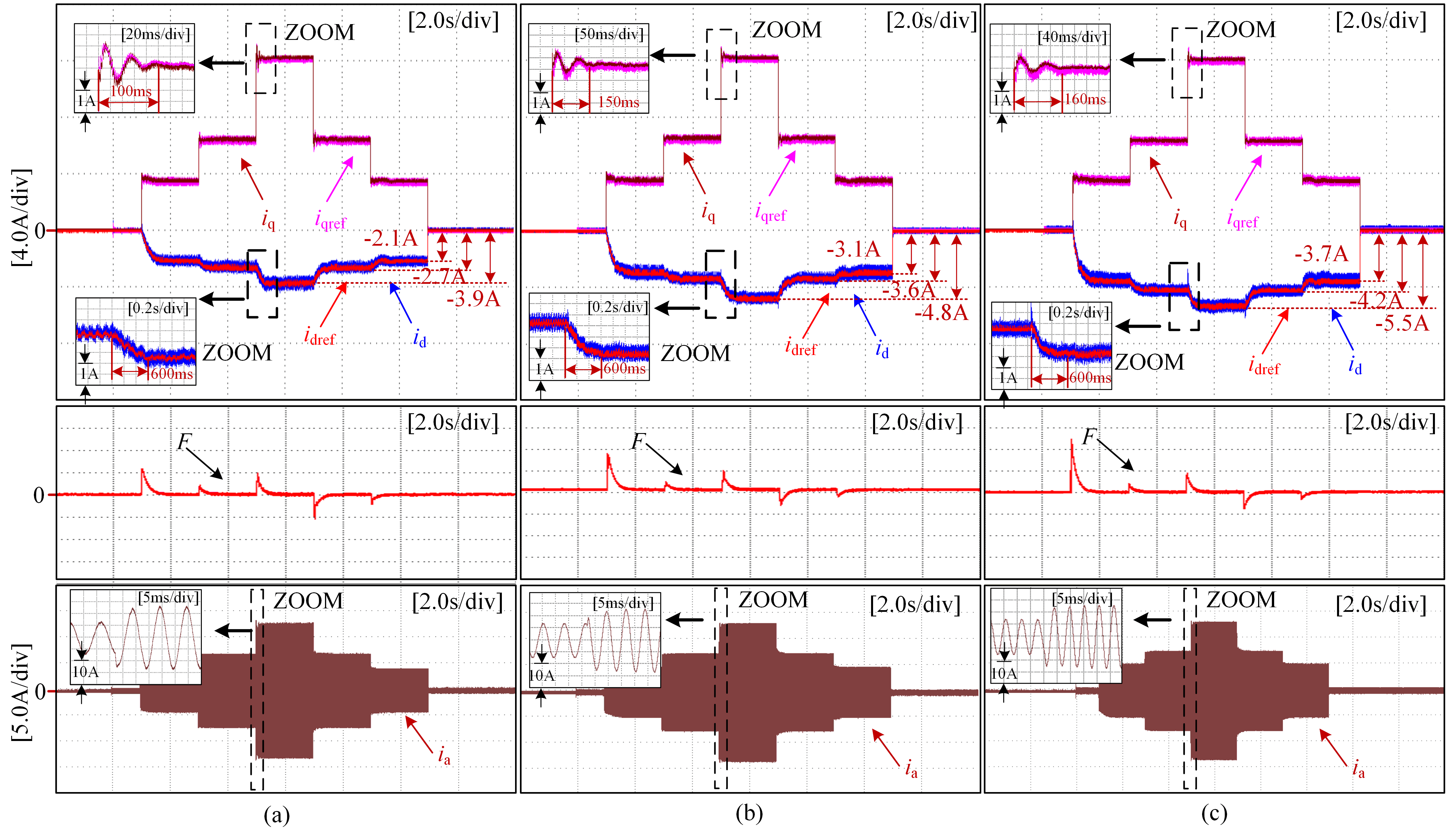 图1 不同工况下,提出方法的d、q轴电流、判别标准F、相电流波形图
