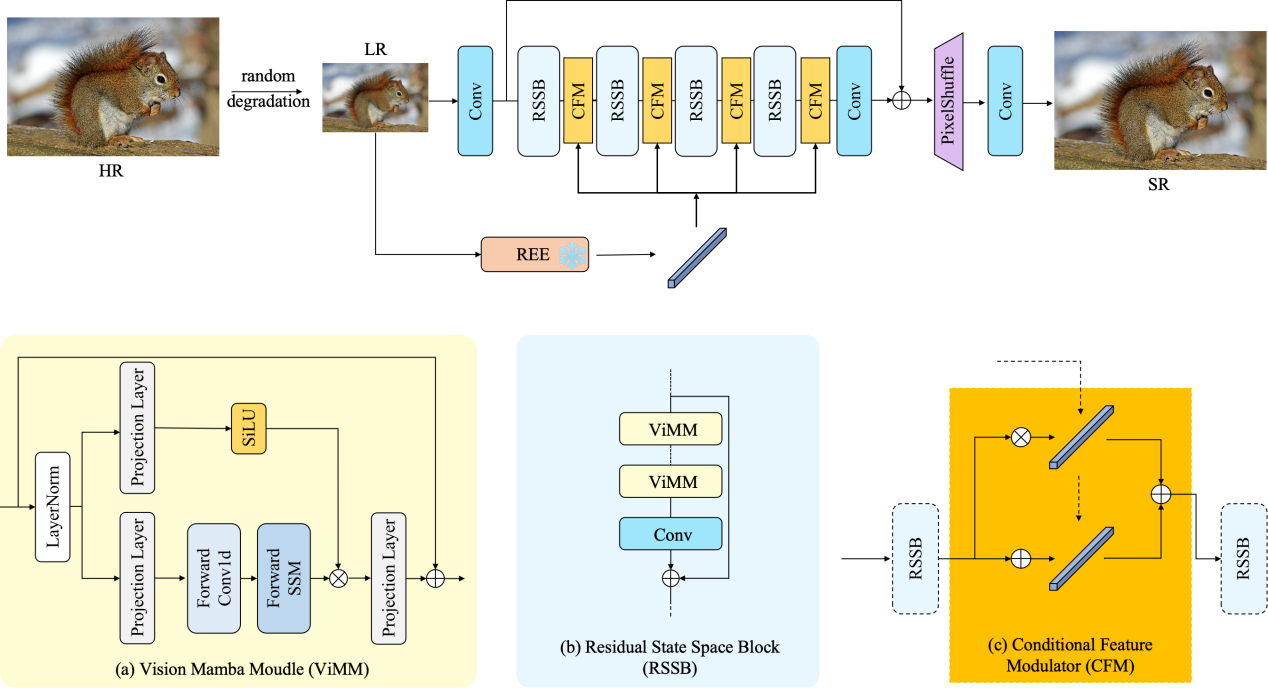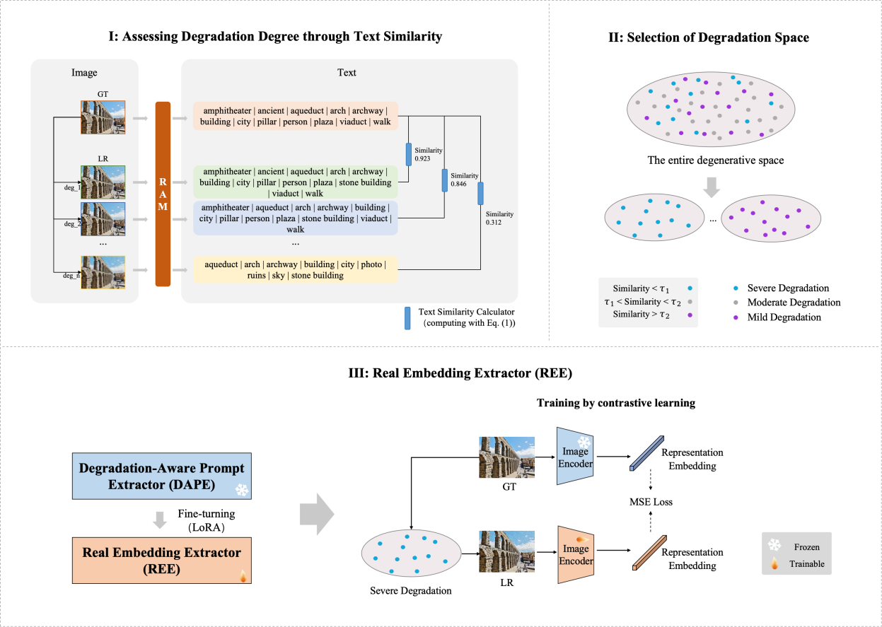 在计算机视觉与多模态人工智能快速发展的背景下,图像超分辨率重建作为图像处理领域的核心方向,广泛应用于安防监控、医学影像、遥感测绘以及高清影像修复等众多实际场景。近年来,多模态大模型利用文本作为条件信息,在图像超分辨率任务中展现出了优异的能力,但在处理退化图像时的表现仍存在局限。本文首先通过计算文本相似度,重新评估了“识别任何事物模型”(RAM)在退化图像上的性能,发现直接采用对比学习在退化空间中微调RAM难以取得理想效果。为此,本文引入了一种退化选择策略,并提出了真实嵌入提取器(REE),通过对比学习显著提升了退化图像内容的识别能力。然后,利用条件特征调制器(CFM)将REE提取的高层语义信息融入一个基于Mamba的强大网络中,使该网络能够充分利用像素级信息恢复图像纹理,生成视觉质量良好的重建结果。大量实验表明,REE能够有效帮助图像超分辨率网络在保真度与感知质量之间取得平衡,同时也展现了Mamba在真实世界图像超分辨率任务中的巨大潜力。